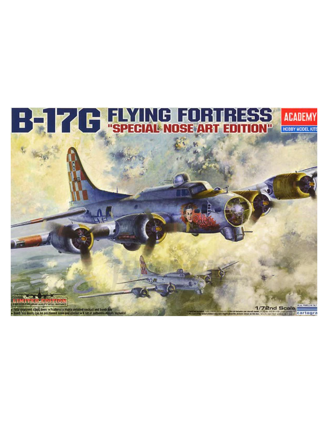 Dieser Bausatz im Maßstab 1:72 zeigt die eindrucksvolle Boeing B-17G Flying Fortress, die bekannteste Version des amerikanischen schweren Bombers aus dem Zweiten Weltkrieg, hier in der Sonderedition Nose Art.