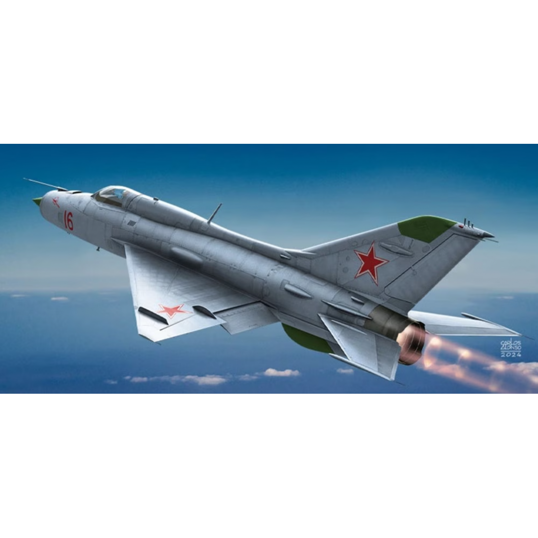 Dieser Bausatz im Maßstab 1:48 stellt den berühmten MiG-21 PF dar – einen der markantesten Abfangjäger des Kalten Kriegs und Symbol sowjetischer Luftstreitkräfte.