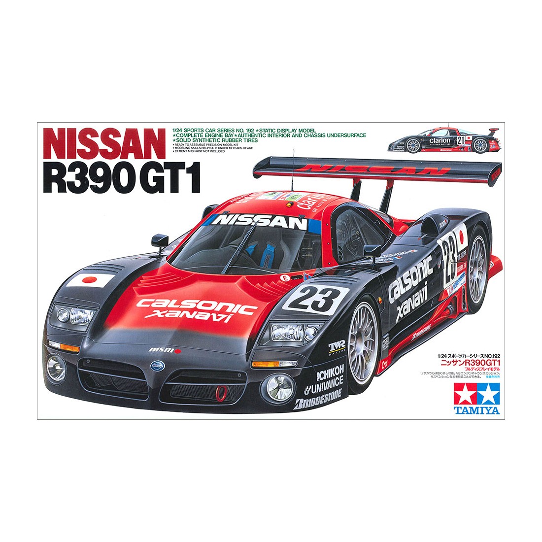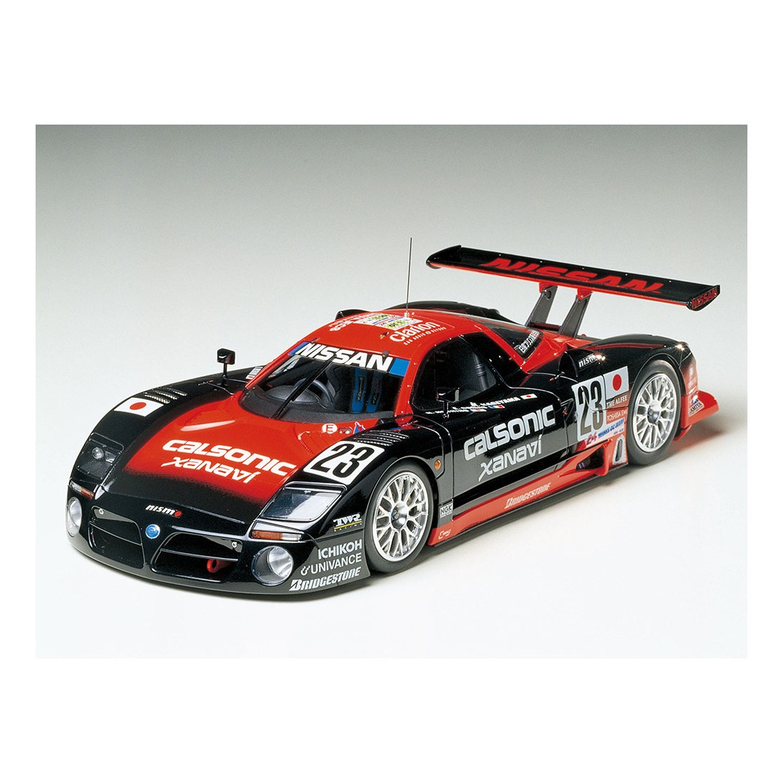 Der Nissan R390 GT1 ist einer der bekanntesten Rennwagen der 1990er Jahre, entwickelt für die 24 Stunden von Le Mans, hier als Modell im Maßstab 1:24 von Tamiya umgesetzt.