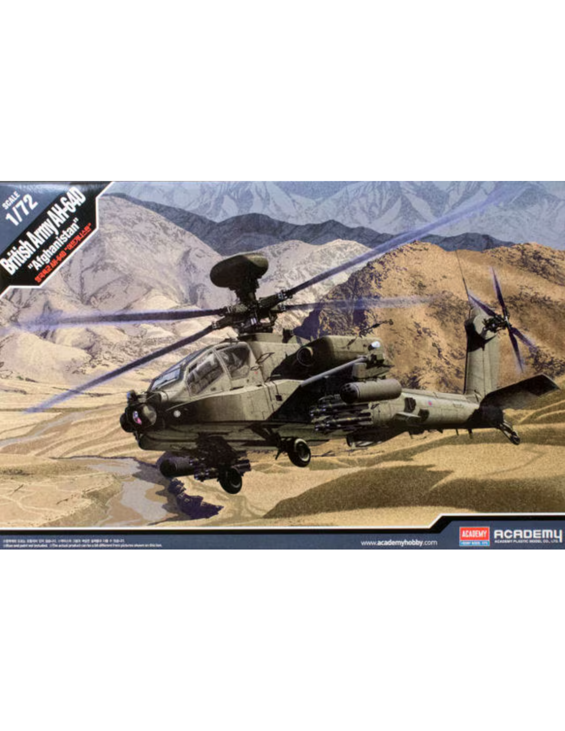 This 1:72 scale model represents the powerful Boeing AH-64D Apache Longbow, as operated by the British Royal Army during missions in Afghanistan, one of the most advanced and feared attack helicopters in the world.