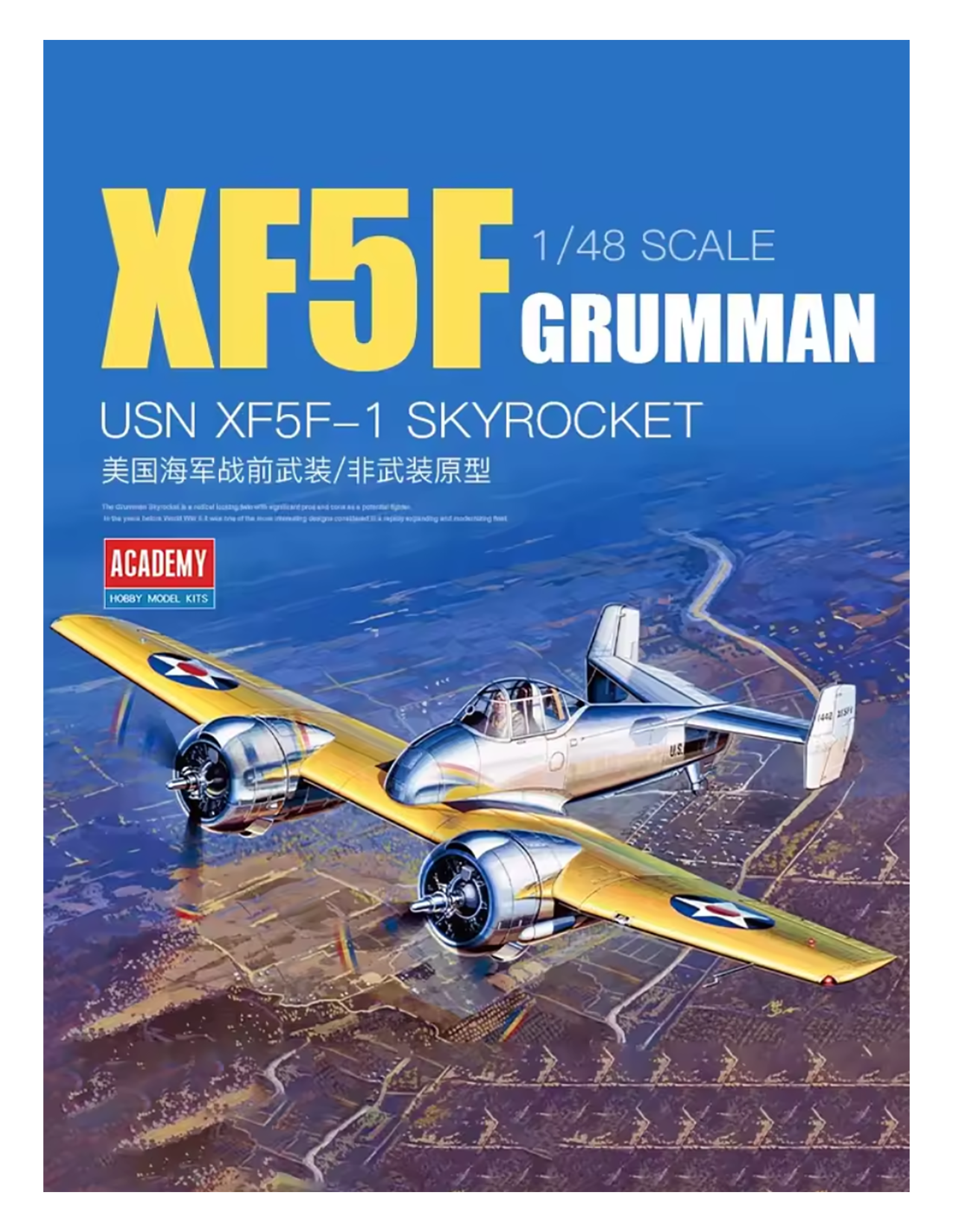 This 1:48 scale model depicts the distinctive Grumman XF5F-1 Skyrocket, an experimental twin-engine fighter designed for the U.S. Navy in the early years of World War II.