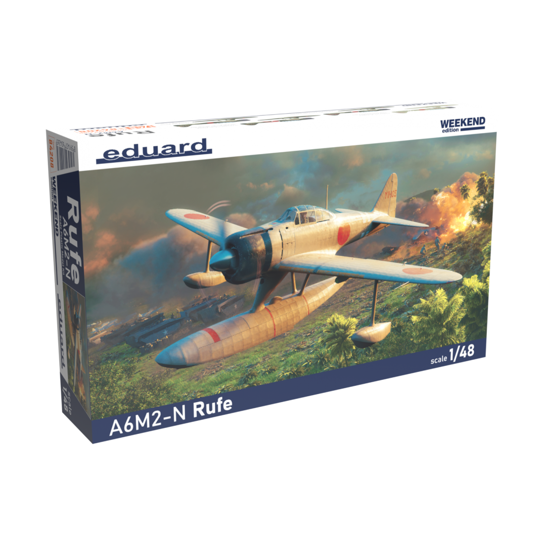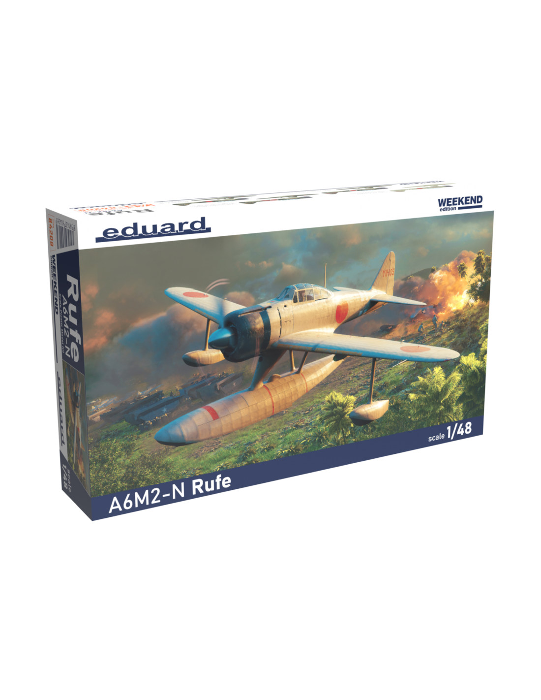 The Eduard A6M2-N Rufe 1/48 kit features high-quality plastic parts, finely engraved surface detail, a well-detailed cockpit, and several historical marking options representing aircraft deployed throughout the Pacific theatre.