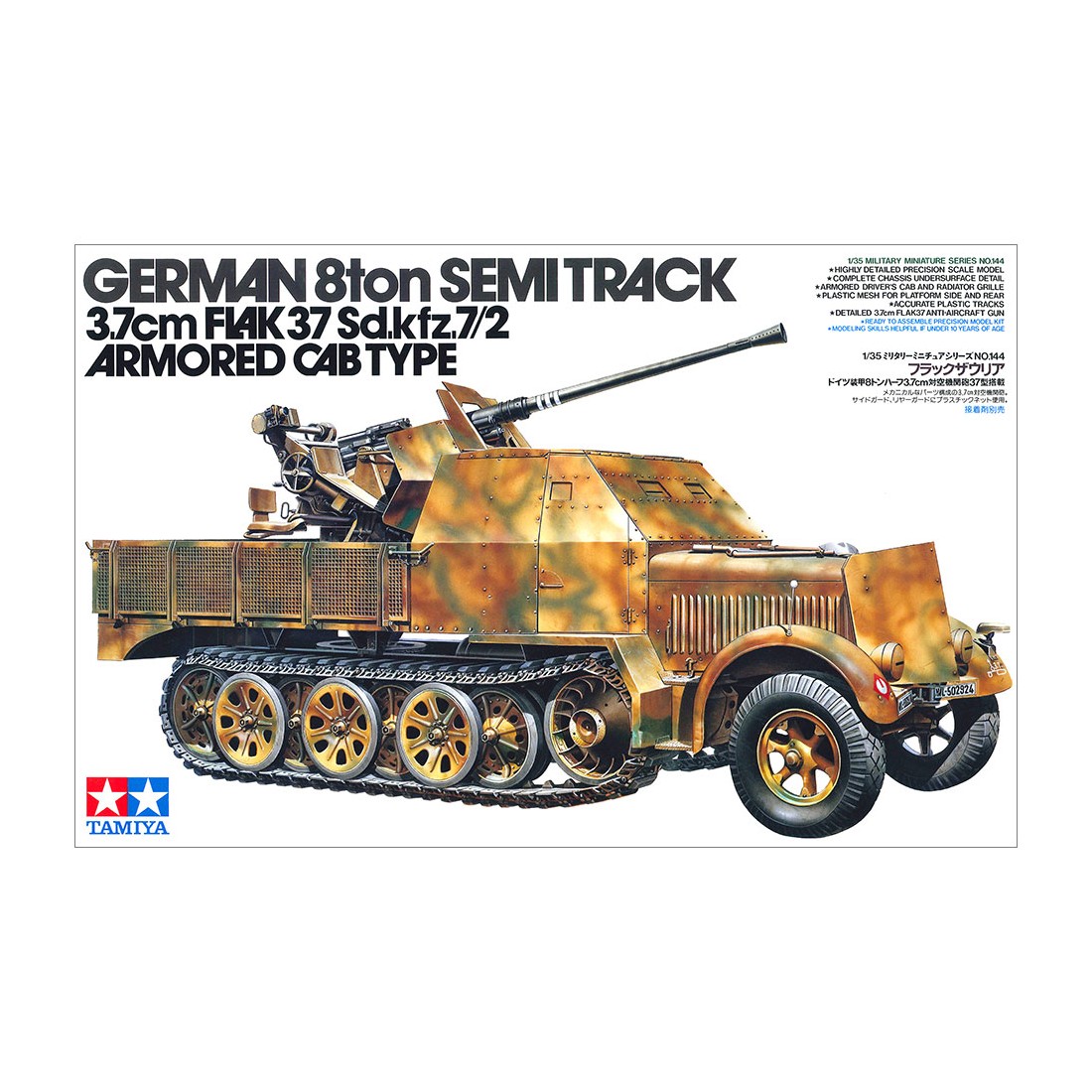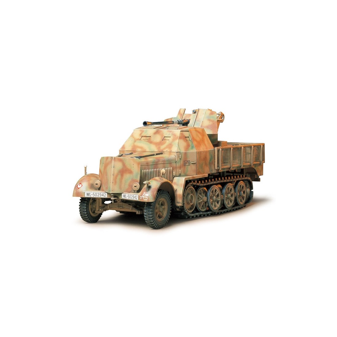 The Sd.Kfz.7/2 is one of the most recognizable German half-track vehicles of World War II, equipped with an anti-aircraft gun, faithfully reproduced by Tamiya in 1:35 scale.