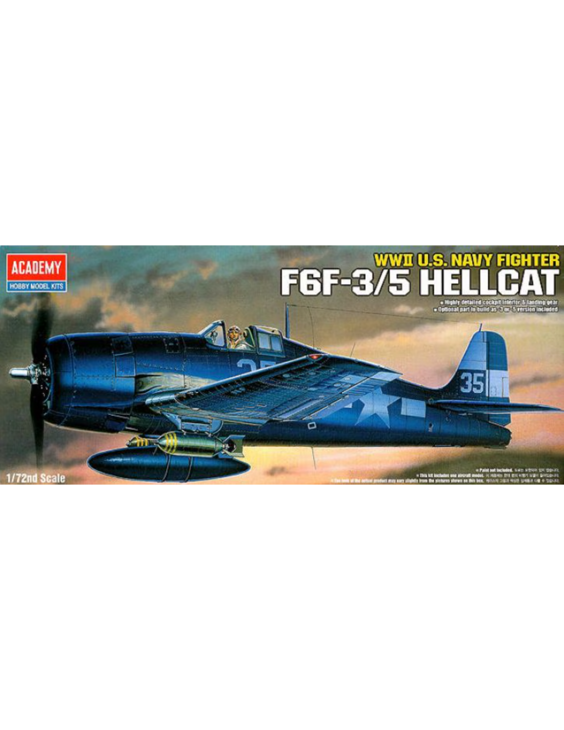 Este modelo a escala 1:72 reproduce el legendario Grumman F6F-3/5 Hellcat, el caza embarcado más exitoso de la US Navy durante la Segunda Guerra Mundial, protagonista del frente del Pacífico.