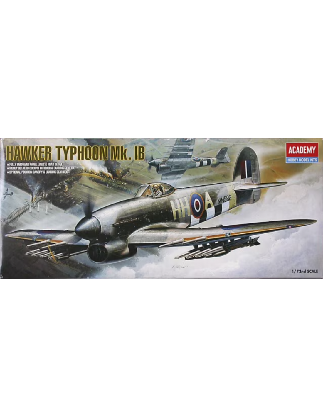 Este modelo a escala 1:72 reproduce el poderoso Hawker Typhoon Ib, uno de los cazas de ataque británicos más temidos de la Segunda Guerra Mundial, diseñado para reemplazar al Hurricane y empleado con gran éxito desde 1943.