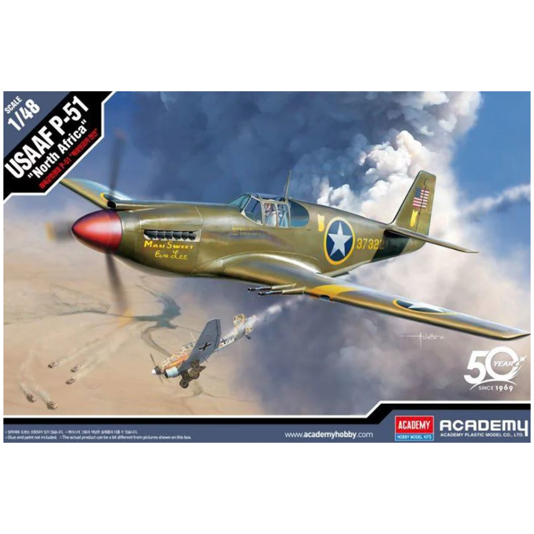 Este modelo a escala 1:48 reproduce el mítico North American P-51 Mustang, protagonista de la campaña del Norte de África durante la Segunda Guerra Mundial.