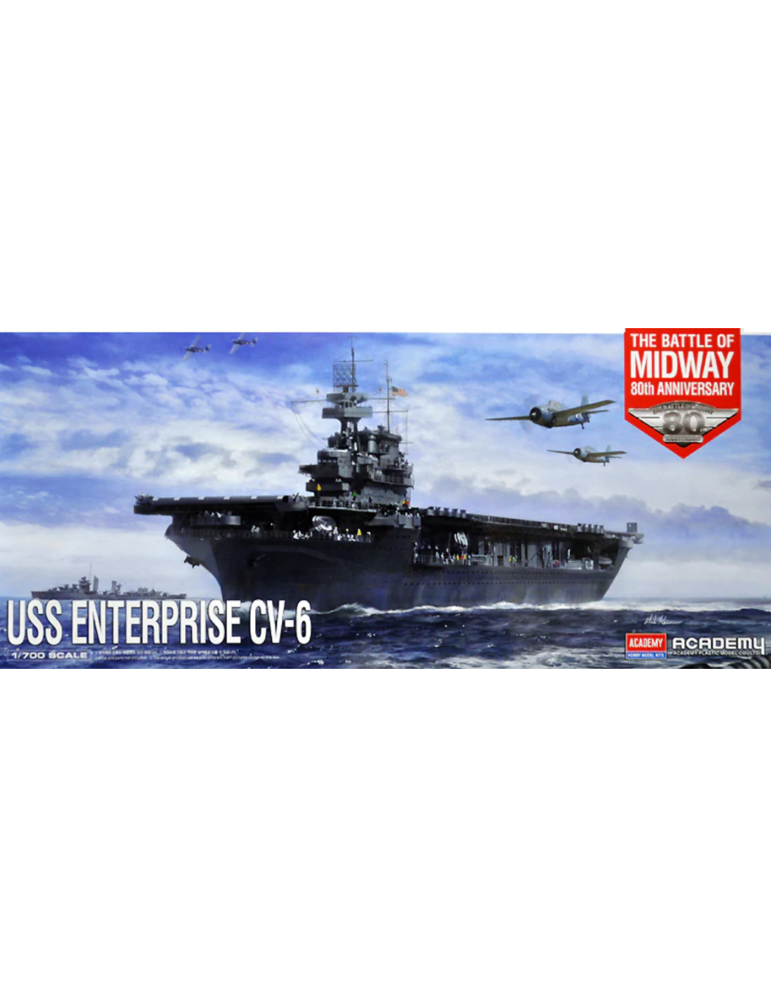 Este modelo a escala 1:700 reproduce el célebre portaaviones USS Enterprise (CV-6), uno de los buques más condecorados de la Marina de los Estados Unidos y protagonista de las principales batallas del Pacífico durante la Segunda Guerra Mundial.