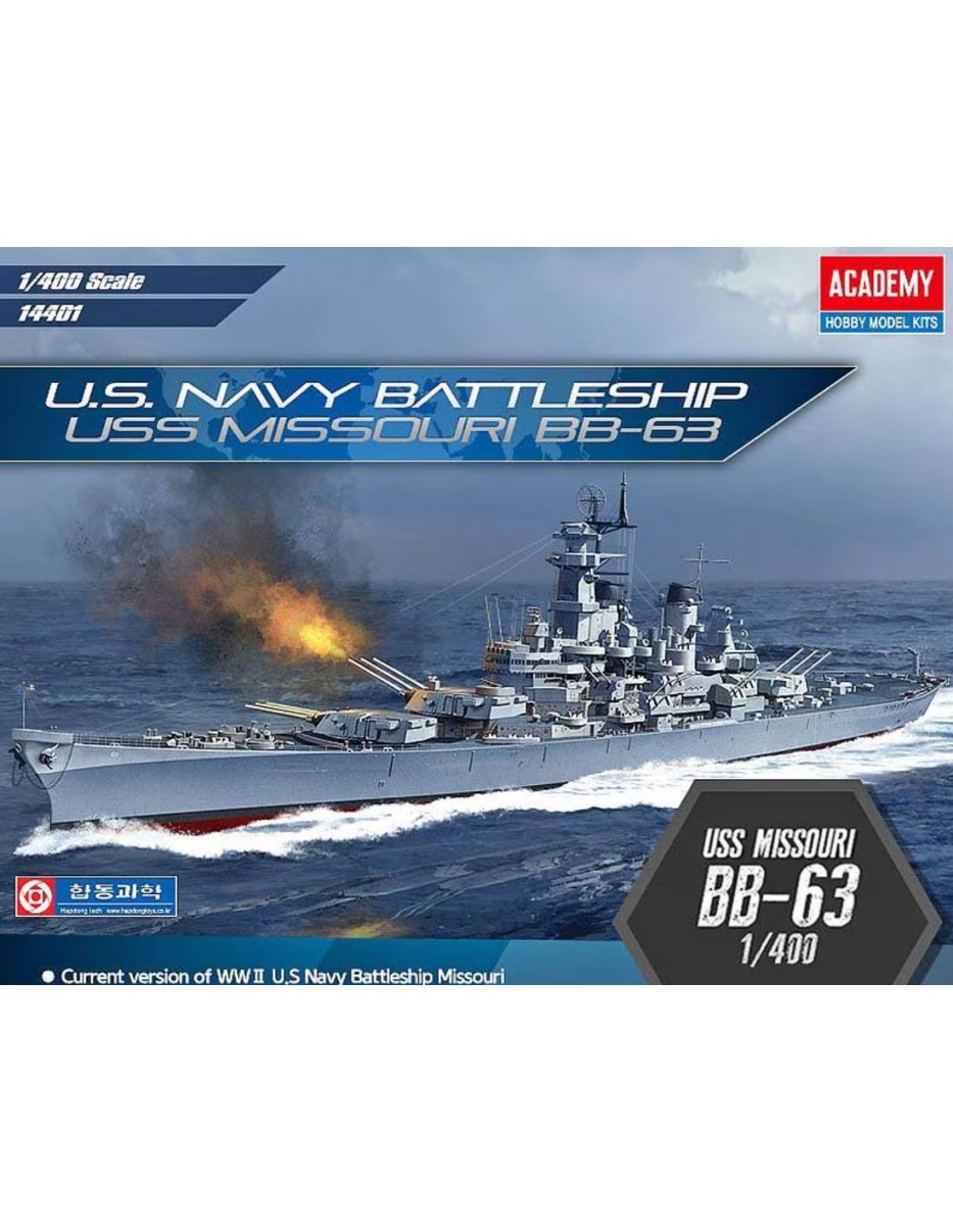 Este modelo a escala 1:400 reproduce el legendario acorazado USS Missouri (BB-63), uno de los buques de guerra más emblemáticos de la Marina de los Estados Unidos y símbolo del fin de la Segunda Guerra Mundial.