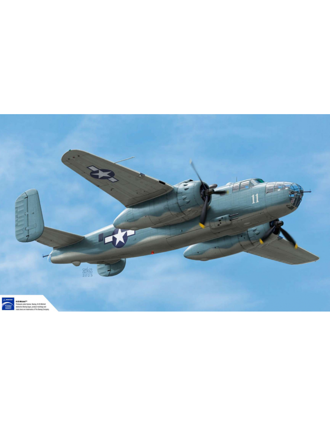Le fuselage présente des panneaux gravés avec finesse, un radôme ventral détaillé, une tourelle dorsale mobile, des mitrailleuses Browning de calibre .50, un compartiment à bombes précis et des moteurs radiaux jumeaux.