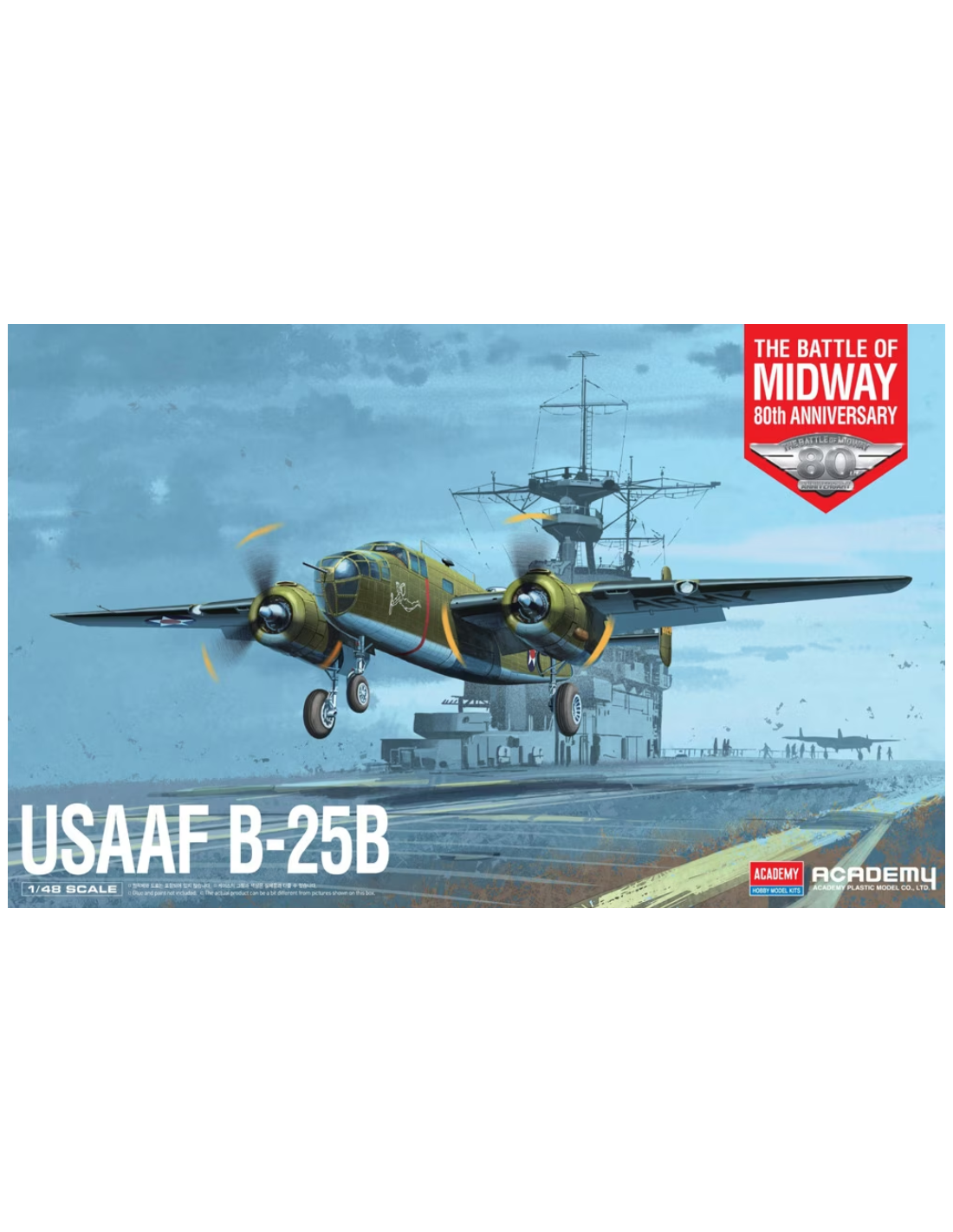 Ce modèle à l’échelle 1:48 représente le célèbre North American B-25B Mitchell, avion emblématique de la USAAF durant les premières campagnes du Pacifique, notamment la bataille de Midway et le raid de Doolittle en 1942.
