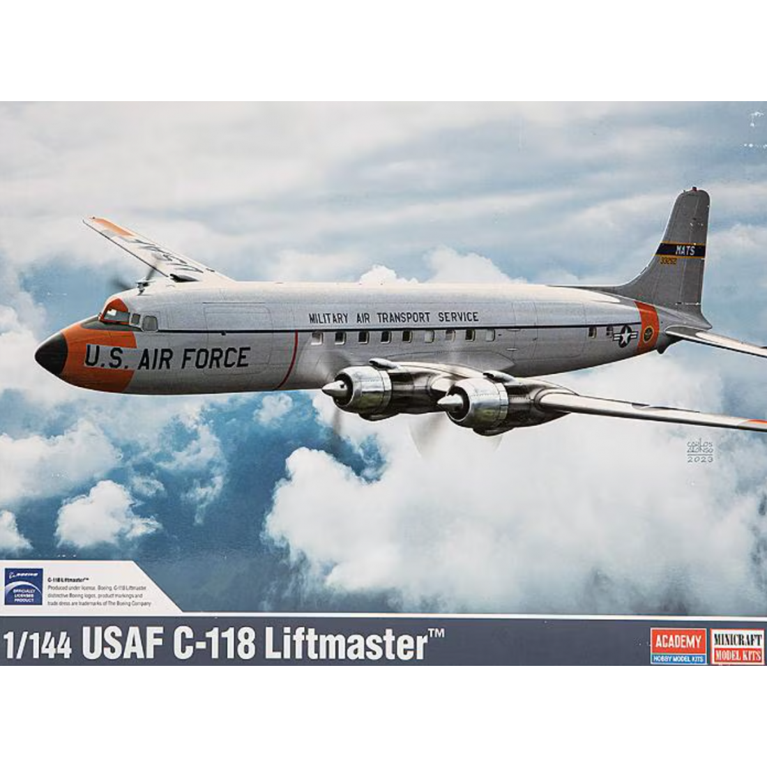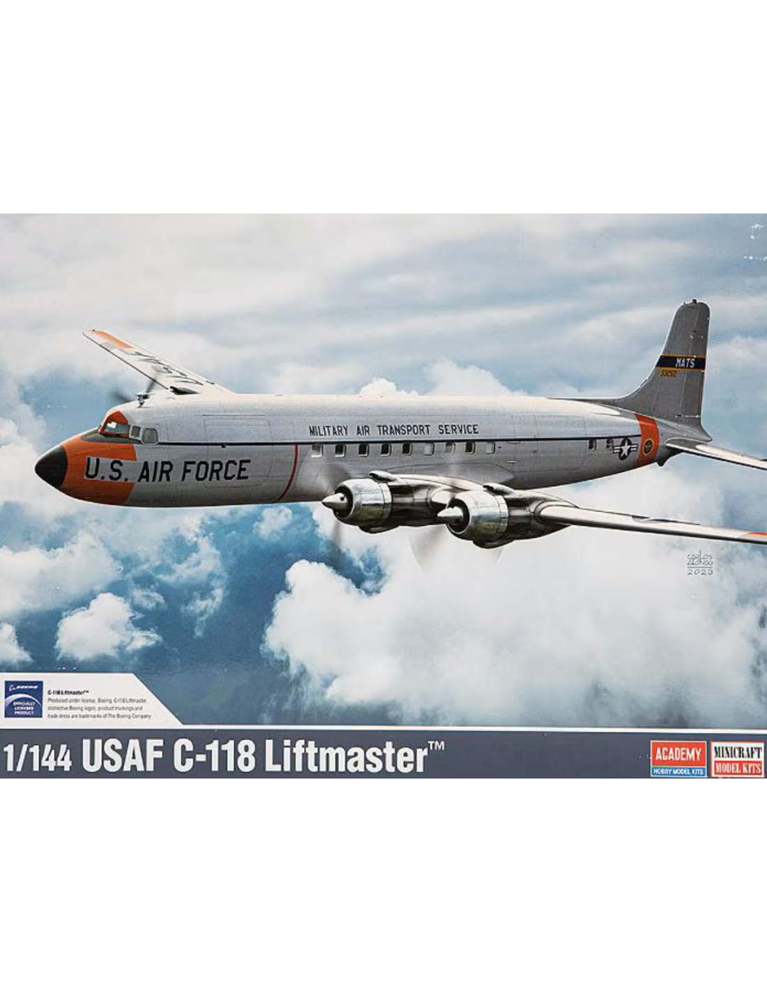 Ce modèle à l’échelle 1:72 représente le prestigieux Douglas C-118 Liftmaster, version militaire du célèbre DC-6 civil, utilisé par l’USAF et la US Navy entre les années 1950 et 1970 pour le transport de troupes et de matériel.