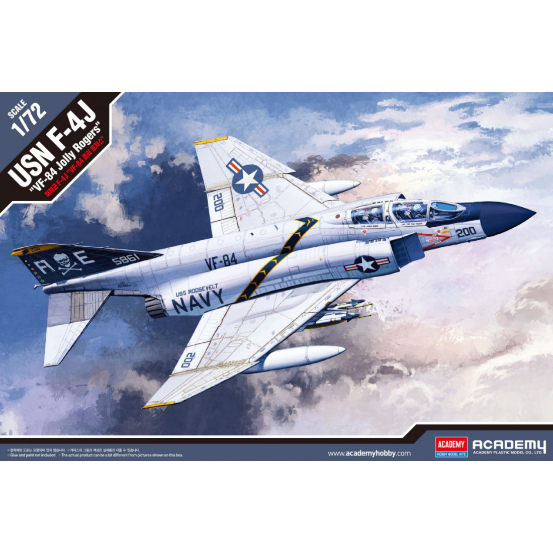 Ce modèle à l’échelle 1:72 représente le célèbre McDonnell Douglas F-4J Phantom II dans la livrée de la légendaire VF-84 “Jolly Rogers”, l’une des unités les plus emblématiques de la marine américaine, reconnaissable à son crâne et os croisés sur la dérive.