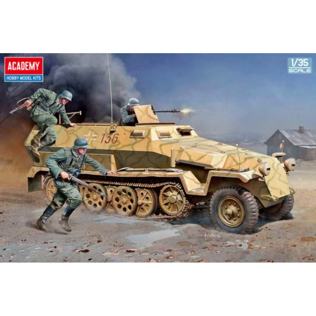 Questo modello in scala 1:35 riproduce il celebre Sd.Kfz.251 Ausf. C, il principale mezzo corazzato da trasporto truppe tedesco della Seconda Guerra Mondiale, impiegato in tutti i fronti dal 1941 al 1945.