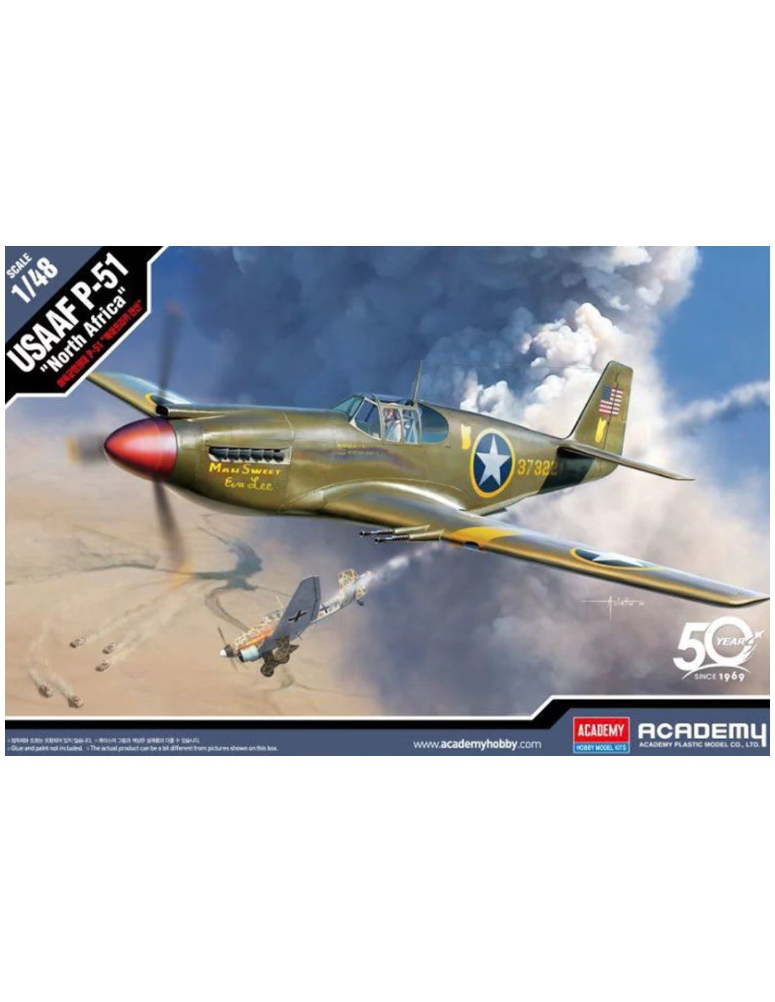 Questo modello in scala 1:48 riproduce il celebre North American P-51 Mustang, protagonista della campagna del Nord Africa durante la Seconda Guerra Mondiale, uno dei caccia più iconici della USAAF.