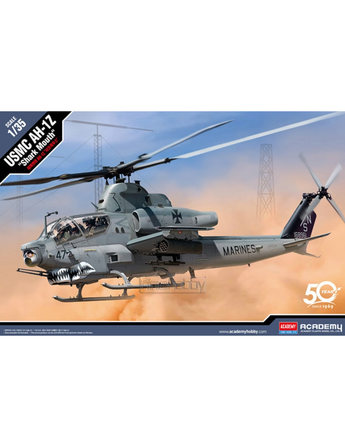Questo modello in scala 1:35 raffigura l’USMC AH-1Z “Shark Mouth”, elicottero da attacco in servizio con il Corpo dei Marines degli Stati Uniti, caratterizzato dalla celebre livrea “bocca di squalo”.